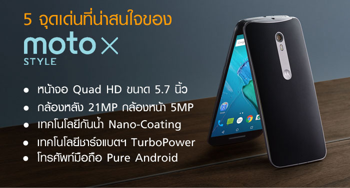 หลังจากห่างหายไปนาน แบรนด์โทรศัพท์มือถืออย่าง "Moto" (หรือ Motorola ที่เรารู้เคยจัก) ก็กลับมาปลุกตลาดบ้านเราอีกครั้ง พร้อมคาราวานสมาร์ทโฟนมากมายหลายรุ่น แต่ละรุ่นก็จะมีจุดเด่นต่างกันไป อย่างเช่นรุ่น Moto X Style ที่เรากำลังพูดถึงอยู่นี้ ก็มาพร้อมตัวเครื่องที่ถูกดีไซน์อย่างเรียบหรู อีกทั้งยังมีจุดเด่นที่น่าสนใจให้กล่าวถึง 5 ข้อด้วยกัน...