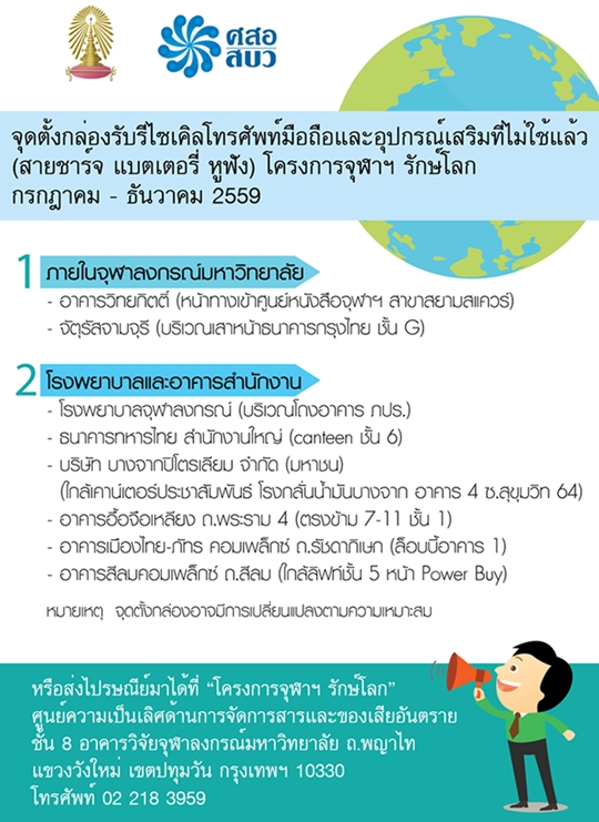 นอกจากนั้นยังมีโครงการดีๆ ที่เราไปเจอมาอีกหนึ่งโครงการนั่นก็คือ "โครงการจุฬาฯ รักษ์โลก" ดำเนินการโดยศูนย์ความเป็นเลิศด้านการจัดการสารและของเสียอันตราย (ศสอ.) จุฬาลงกรณ์มหาวิทยาลัย ตั้งแต่ปี 2553 จนถึงปัจจุบัน โดยมีวัตถุประสงค์เพื่อสร้างความรู้และความเข้าใจในเรื่องการจัดการขยะอิเล็กทรอนิกส์อย่างถูกวิธี รวมทั้งเป็นหน่วยงานกลางในการเก็บและรวบรวมขยะอิเล็กทรอนิกส์ โดยเฉพาะโทรศัพท์มือถือ แบตเตอรี่และอุปกรณ์เสริมที่ไม่ใช้แล้ว (สายชาร์จ หูฟัง) และนำไปกำจัดอย่างถูกวิธี เพื่อเป็นการป้องกันการเกิดปัญหาจากการจัดการขยะที่ไม่ถูกต้อง เพราะสารอันตรายในโทรศัพท์มือถือและอุปกรณ์เสริม อาจรั่วไหลสู่สิ่งแวดล้อมและยังทำให้เกิดอันตรายต่อสุขภาพได้ และอุปกรณ์เหล่านี้ยังสามารถนำไปรีไซเคิลเพื่อนำทรัพยากรกลับมาใช้ประโยชน์ได้ใหม่