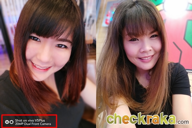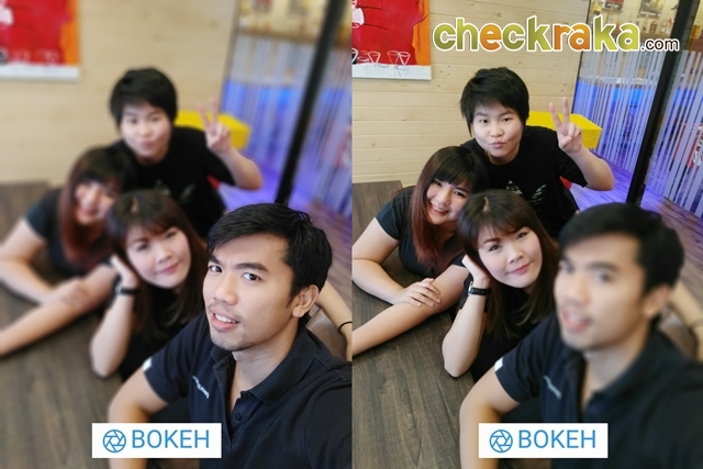 จะเห็นได้จากในภาพ หากเราทำการเซลฟี่กับเพื่อนๆ แล้วเปิดโหมด Bokeh ไว้ กล้องก็จะจับคนข้างหน้าชัดส่วนหลังจะเบลอ แต่เราก็สามารถปรับเปลี่ยนแก้ไขได้ทีหลังอย่างเช่นในรูป หรือจะทำให้ชัดทุกคนภายหลังก็ยังได้ค่ะ และมาที่โหมดไฟ Soft Light ให้ความรู้สึกเหมือนกับมีไฟสตูดิโอติดตัวจริงๆ เพราะเมื่อถ่ายภาพออกมานั้นหน้าจะดูสว่าง ออร่าจับเป็นธรรมชาติ ซึ่งโหมดนี้เราสามารถเลือกได้ว่าตั้งให้เป็นอัตโนมัติ, เติมแสง, หรือว่าจะปิดก็ได้ แต่ผู้เขียนได้ตั้งโหมด Soft Light ให้เป็นอัตโนมัติไว้ เมื่อลองปิดไฟในห้องให้มืดมีเพียงไฟรกระพริบดวงเล็กๆ แล้วเปิดกล้องหน้าปุ๊ปโหมด Soft Light นั้นก็ทำงานทันที จะเห็นได้ว่าสามารถถ่ายภาพหน้าเราให้ชัดได้แม้จะอยู่ในที่มืด ไม่ทำให้ดูขาวสว่างเกินไป ผู้เขียนได้ลองใช้ Soft Light จากเครื่องของตัวเองนั้นบอกได้เลยว่ามองเห็นเพียงลางๆ ไม่คมชัดเหมือนกับเจ้า vivo V5 Plus เลยสักนิด