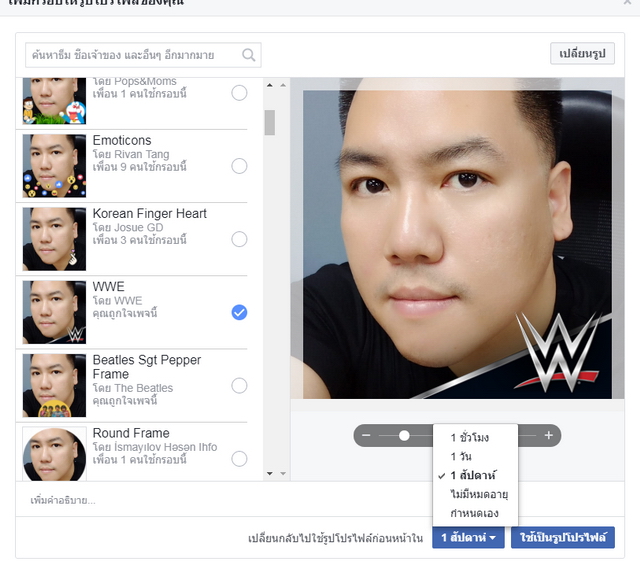 นอกจากนี้ ยังมีฟังก์ชั่นให้เราได้กำหนดเวลาการใส่กรอบภาพโปรไฟล์ โดยปกติระบบจะตั้งเวลาให้เป็นเวลา 1 สัปดาห์ หรือจะกำหนดเอง โดยตั้งเป็น 1 ชั่วโมง, 1 วัน หรือแบบไม่มีหมดอายุ ก็สามารถกำหนดเองได้อย่างละเอียด
