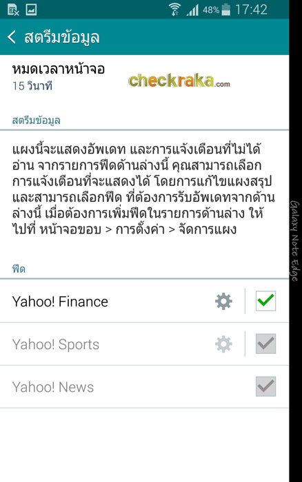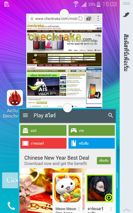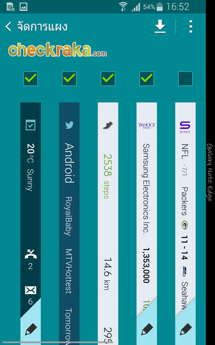 ส่วนการเพิ่มหน้าจอที่สองตรงขอบด้านขวาก็ช่วยให้เราใช้หน้าจอหลักเพื่อดูสิ่งต่างๆ ได้เต็มตามากขึ้น เพราะหน้าจอที่สองนี้จะช่วยแสดงผล Notification ข้อความ SMS สายโทรศัพท์เข้า และช็อตคัทต่างๆ แทนนั่นเอง ทั้งนี้ หน้าจอที่สองตรงขอบด้านข้างขวามืออันคมชัดยังสามารถปรับแต่งสิ่งต่างๆ ได้ตามต้องการ (เรียกได้ว่าไม่ได้มีไว้โชว์อย่างเดียวเท่านั้น แต่ใช้งานได้ดีเลยทีเดียว) ไม่ว่าจะเป็นการเลือกให้โชว์การแจ้งเตือนสิ่งต่างๆ รวมถึงเป็นช็อตคัทเรียกแอปบางตัวได้ตรงนี้ (ที่ผมชอบ เพราะมีแอป เช่นไฟฉาย, ไม้บรรทัด, ตัวนับเวลา, นาฬิกาปลุก และเครื่องอัดเสียงด้วย) โดยมีเมนูการตั้งค่าให้เราเลือก อยากจะจัดแบบไหนก็เลือกเลยตามที่เราต้องการให้เป็นได้เลย อย่างไรก็ตาม ในตอนนี้อาจจะมีแอปที่รองรับการใช้งานตรงหน้าจอนี้น้อยไปหน่อย แต่ถ้า Galaxy Note Edge รุ่นแรกนี้ประสบความสำเร็จ อนาคตเราคงได้เห็นจำนวนแอปที่เพิ่มมากขึ้นอย่างแน่นอน