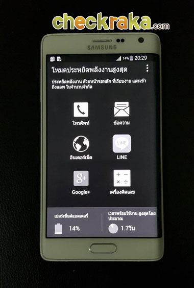 เมื่อใช้โหมด Ultra Power Saving Mode จะเห็นได้ว่าแบตเตอรี่ที่เหลืออยู่ 14% จะสามารถใช้งานได้ถึง 1.7 วัน