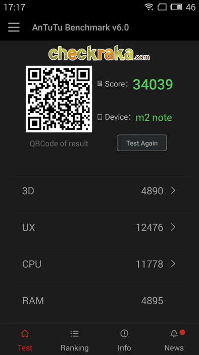 การทดสอบประสิทธิภาพของเครื่องด้วยแอปฯ AnTuTu Benchmark (แอปฯ ทดสอบประสิทธิภาพชื่อดังที่ใช้ได้ทั้งบนแท็บเล็ตและโทรศัพท์มือถือ) สามารถทำคะแนนได้ที่ 34,039 คะแนน