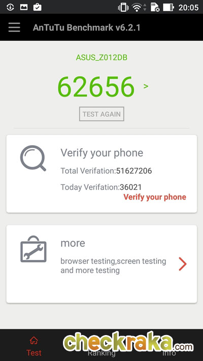 ผลการทดสอบประสิทธิภาพความเร็วด้วย Antutu Benchmark ได้ 62,656 คะแนน