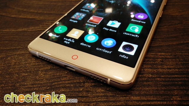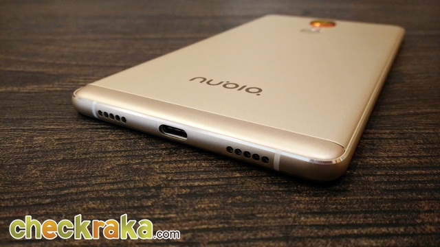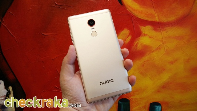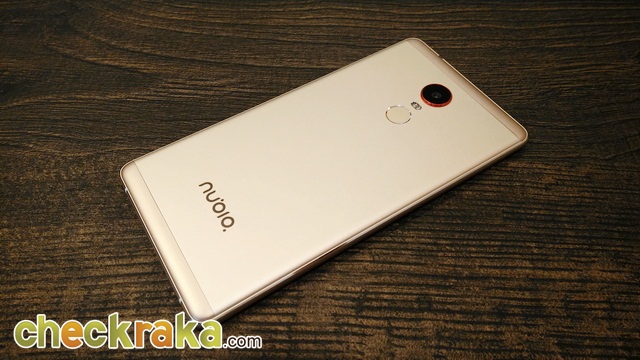 ด้านหลังเป็นโลหะ ส่วนด้านบนและด้านล่างจะมีส่วนที่เป็นพลาสติคเพราะมีเสาอากาศอยู่ตรงนั้นครับ กล้องมีความละเอียด 16MP นูนขึ้นมาเล็กน้อย วงแหวนกล้องเป็นสีแดง สวยดีนะครับ และไฟแฟลชคู่แบบทูโทน ถัดลงมาจะเป็นเซ็นเซอร์สแกนลายนิ้วมือ และโลโก้ Nubia