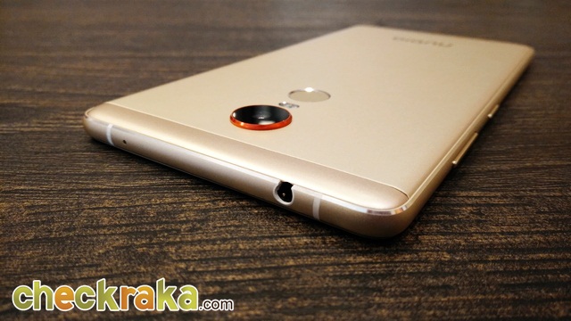 ขอบตัวเครื่องมีการเจียรขอบแบบ Diamond Cut ช่วยให้ดูแวววาวหรูหรามากขึ้น ด้านบนมีไมค์ตัดเสียงรบกวน และพอร์ทหูฟังขนาด 3.5 มม. จะเห็นว่าขอบเครื่องบางมาก จนแทบจะวางตำแหน่งพอร์ทหูฟังไม่ได้เลยทีเดียว ส่วนด้านล่างทางซ้ายจะเป็นไมโครโฟน ส่วนด้านขวาจะเป็นลำโพงตัวเครื่อง เสียงดังและเพราะใช้ได้ครับ และรุ่นนี้จะใช้ USB Type-C