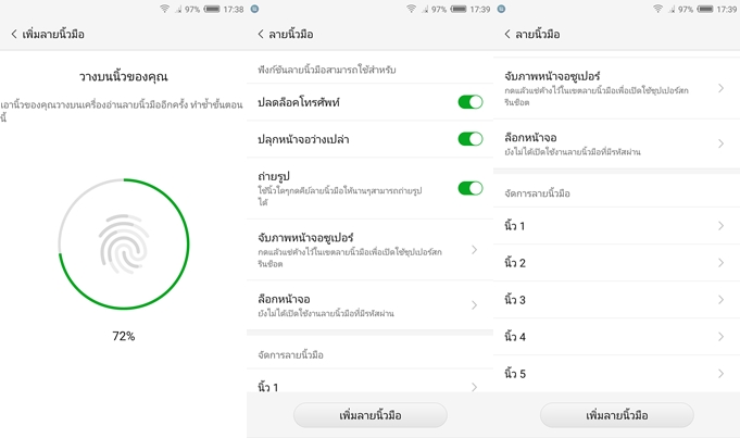 เซ็นเซอร์สแกนลายนิ้วมือ สามารถสแกนได้สูงสุด 5 ลายนิ้วมือ ความแม่นยำทำได้ดี สามารถใช้เป็นปุ่ม Shutter เวลาถ่ายภาพได้ และถ้าแตะค้างจะเข้าโหมดจับภาพหน้าจอแบบพิเศษได้ด้วยครับ