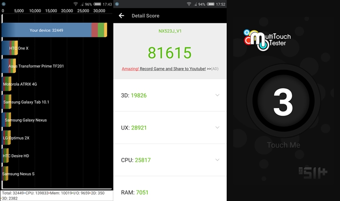 Nubia Z11 Max สเปคสูงเกินราคาครับ ชิปเซ็ต Qualcomm MSM8976 Snapdragon 652, CPU Octa-core (4x1.8 GHz Cortex-A72 & 4x1.4 GHz Cortex-A53), GPU Adreno 510, RAM 4GB, หน่วยความจำภายใน 64GB สามารถเพิ่ม Micro SD Card ได้สูงสุด 256GB มาดูคะแนนทดสอบกัน