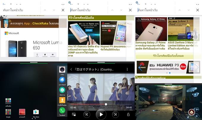 การทำงานแบบ Multi Window เพียงแค่รูดนิ้วจากด้านล่างขึ้นไป ก็จะเป็นการเปิดการทำงานแล้วครับ สามารถใช้งานแยกออกจากกันได้อย่างอิสระ สามารถเล่นเกมไปด้วย ท่องเว็บไปด้วย หรือจะเปิดคลิปวีดีโอขึ้นมาดูก็ยังได้ วิธีสลับหน้าจอก็แค่แตะที่หน้าจอเพื่อเลือกเท่านั้นเอง และสามารถปรับขนาดหน้าจอได้ตามใจชอบ สลับการทำงานได้อย่างลื่นไหลน่าประทับใจทีเดียวครับ