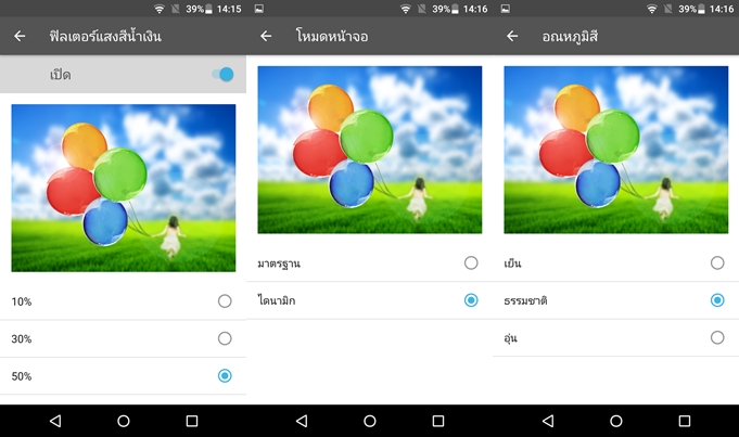 ในส่วนของการปรับโทนสีหน้าจอ มีใส่มาให้เยอะมากครับ แต่น่าแปลกที่ไม่รวมกันเป็นหัวข้อเดียว แยกออกจากกันซะงั้น โดยเราสามารถปรับค่ากรองแสงเพื่อถนอมสายตา, ความคมชัดของหน้าจอ, อุณหภูมิสีหน้าจอ