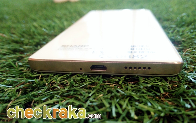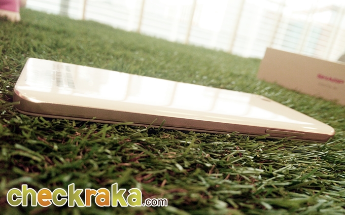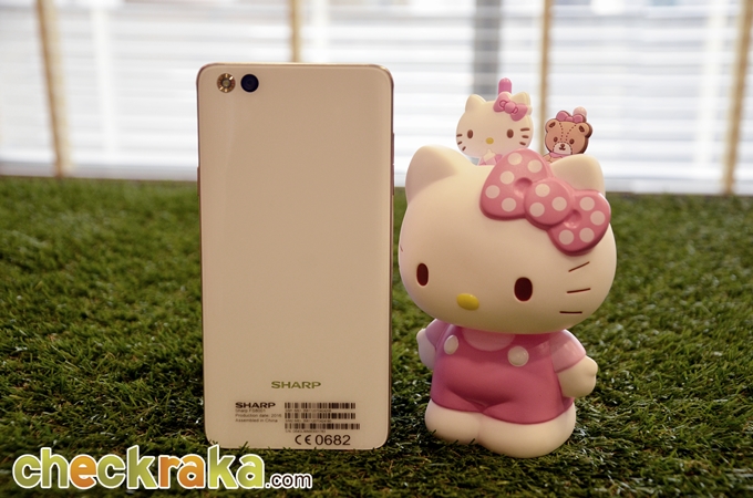 ด้านหลังของตัวเครื่องประกอบด้วย กล้องหลัง 13 ล้านพิกเซล, ไฟแฟลช LED และโลโก้ Sharp