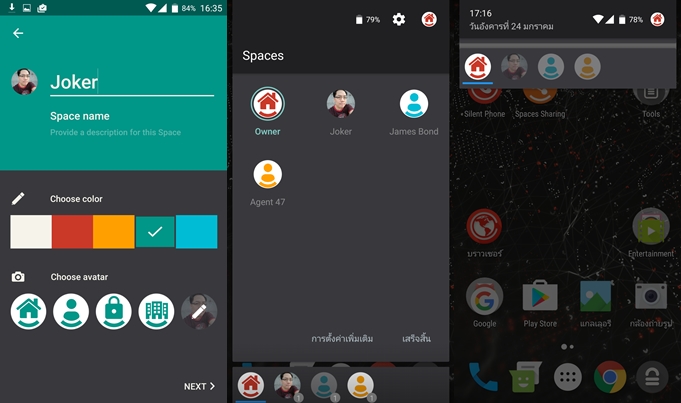 แถมยังสามารถสลับ Account ไปมาได้อย่างง่ายดาย และรวดเร็ว เท่าที่ทดสอบมายังไม่เจออาการแปลกๆ ในการสลับ Account เลยครับ ทำออกมาได้เสถียรดีมาก และถ้าเราขี้เกียจลงแอปพลิเคชัน หรือไฟล์ต่างๆ ใหม่ในทุก Account เราสามารถใช้งานฟังก์ชั่น Space Sharing เพื่อแชร์แอปพลิเคชั่น, ภาพ, เพลง, วีดีโอ, รายชื่อ และไฟล์ต่างๆ ให้กับ Account ที่เราตั้งขึ้นมาได้อีกด้วย โดยพื้นที่ภายในเครื่องจะถูกใช้งานเพิ่มขึ้นนะครับ เพราะเป็นการ Copy เพิ่มเข้าไป ซึ่งจริงๆ ตอนที่เราตั้งค่าใน Spaces Management ก็จะมีให้เลือกแชร์อยู่แล้ว แต่ถ้าลืมหรือขี้เกียจเลือกตอนที่ตั้งค่า ก็มาใช้งานฟังก์ชั่นนี้ได้เลย