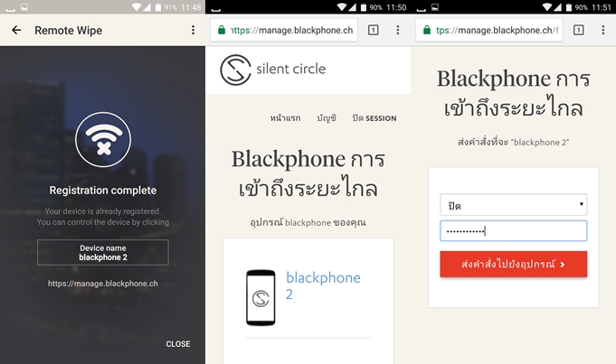 Remote Wipe สามารถสั่งการควบคุมเครื่องแบบระยะไกล โดยเราสามารถสั่งปิดหน้าจอ หรือลบข้อมูลทั้งหมดในเครื่อง Blackphone 2 ของเราได้ผ่านทางเว็บไซต์ ซึ่งจริงๆ ระบบ Android ก็สามารถทำได้เหมือนกันนะครับ แต่ต่างกันที่ Silent OS จะไม่ระบุตำแหน่งว่าเราสั่งลบข้อมูลที่ไหน มันจะเป็นความลับ (แหม...เหมาะกับสายลับ หรืออาชีพที่มีความสุ่มเสี่ยงสุดๆ เลยนะครับ)