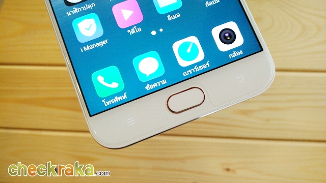 สำหรับด้านล่างจะเป็นปุ่มสัมผัส ด้านซ้ายเป็นปุ่ม Recent App ส่วนด้านขวาเป็น Back และตรงปุ่ม Home จะมีเซ็นเซอร์สแกนลายนิ้วมือ โดยเราสามารถกดที่ปุ่ม Home ได้นะครับ แต่ตอนสแกนหรือสั่งงาน แค่สัมผัสเบาๆ ก็ทำงานแล้ว สำหรับในส่วนการสแกนลายนิ้วมือ Vivo เป็นอีกแบรนด์ที่ต้องขอชมครับ เพราะความไวและความแม่นยำทำได้น่าประทับใจมากทีเดียว แถมสามารถตั้งค่าลายนิ้วมือได้สูงสุด 5 ลายนิ้วมือ