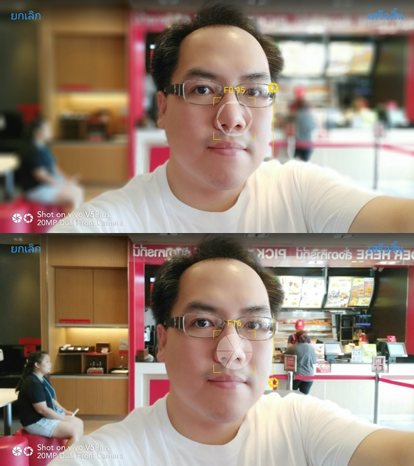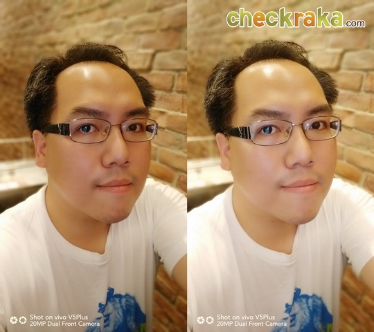 Vivo V5 Plus มาพร้อมกล้องหน้าคู่ความละเอียด 20MP + 8MP ค่ารูรับแสง F2.0 เซ็นเซอร์กล้อง Sony IMX376 และชิ้นเลนส์ 5 ชั้น และไฟแฟลช Selfie Softlight Flash ซึ่งจะส่องสว่างแบบนุ่มนวล ช่วยให้ผิวกระจ่ายใส ไม่ดูโอเวอร์ สามารถถ่ายภาพ Bokeh Mode ด้วยความสามารถของกล้องคู่ ทำให้เราสามารถเลือกโฟกัสไปที่ใบหน้า หรือฉากหลังได้ตามใจชอบ และปรับฉากหลังให้เบลอได้หลากหลายระดับ เหมือนเราปรับค่ารูรับแสงบนกล้องระดับโปร และมีฟังก์ชั่น Shot Refocus ช่วยให้เราเลือกจุดโฟกัสบนภาพได้ตามใจชอบ และใส่ลายน้ำเท่ๆอวดความเป็นกล้องคู่กันได้ด้วยนะครับ