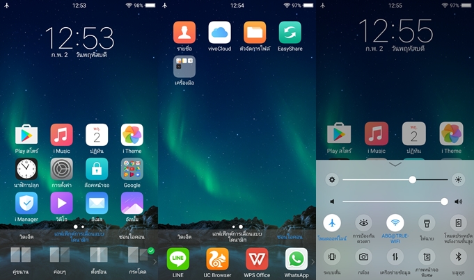 การลากนิ้วขึ้นมาจากด้านล่างเป็นการเรียกใช้งาน Quick Toggle ต่างๆ มีฟังก์ชั่นปรับแสงหน้าจอ และระดับเสียง ที่น่าสนใจก็คือ Vivo มีในส่วน Recent App แยกออกมาแล้วนะครับ (ก่อนหน้านี้ไปรวมเป็นไอค่อนใว้เหนือ Quick Toggle) ส่วนด้านบนลากนิ้วลงมาจะเป็น Notification ก็ปรับเปลี่ยนไปเพียงเล็กน้อยครับ แต่การใช้งานให้ความรู้สึกเรียบ และสมูทมากขึ้นเยอะเลยทีเดียว