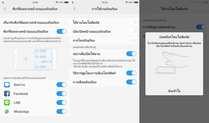สามารถใช้งาน 2 หน้าจอได้ในเวลาเดียวกัน แต่ใช้งานได้เฉพาะบางแอพพลิเคชั่นเท่านั้น (เฉพาะที่แจ้งเตือน) รุ่นนี้ยังคงมาพร้อม Gesture และ Motion Gesture แบบจัดเต็มทีเดียว คนที่ชอบลูกเล่นเท่ๆแบบนี้น่าจะชอบใจ มีทั้งโบกฝ่ามือเพื่อปลดล็อกโทรศัพท์ หรือแตะหน้าจอ 2 ครั้งเพื่อปิดหน้าจอเป็นต้น