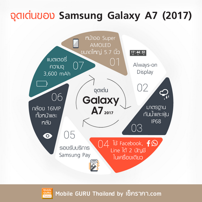 Samsung Galaxy A7 (2017) เป็นสมาร์ทโฟนที่มีดีไซน์สวยงาม วัสดุและการประกอบคุณภาพดี สีสันสวยมากๆ สเปคสูงน่าใช้ หน้าจอใหญ่ รวมทั้งจุดเด่นต่างๆ ไม่ว่าจะเป็นมาตรฐานกันน้ำและฝุ่น IP68 รองรับบริการ Samsung Pay และ Secure Folder ช่วยให้ผู้ใช้สามารถใช้ Facebook, Line และอื่นๆ 2 ID ได้ด้วยในเครื่องเดียวกัน แถมกล้องยังคุณภาพดีมาก แบตเตอรี่ก็อึด เป็นสมาร์ทโฟนที่น่าใช้มากจริงๆครับ ที่สำคัญราคาในตอนนี้ยังคุ้มค่าเร้าใจมากๆอีกด้วย