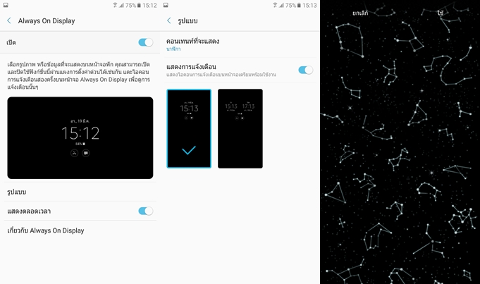 Samsung Galaxy A7 (2017) รองรับฟังก์ชั่น Always-on Display นั่นก็คือการแสดงภาพบนหน้าจอตลอดเวลา แม้เราจะปิดหน้าจออยู่ ซึ่งก็กินแบตเตอรี่ไม่มากครับ เหมาะกับคนที่ไม่อยากคอยเปิดหน้าจอเพื่อดูเวลาบ่อยๆ โดยสามารถแสดงได้ทั้งรูปแบบนาฬิกา, ปฎิทิน และรูปภาพ (เข้าไปเปิด-ปิดได้ที่การตั้งค่าหน้าจอ)
