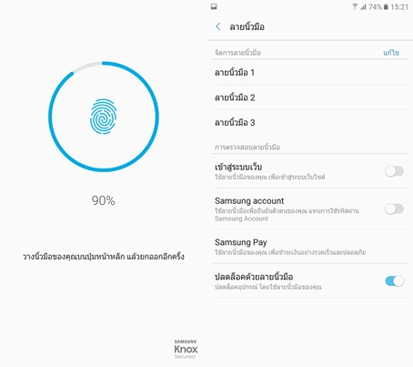 สแกนลายนิ้วใน Samsung Galaxy A7 (2017) สามารถตั้งค่าได้ 3 ลายนิ้วมือ และรุ่นนี้รองรับบริการ Samsung Pay ด้วยนะครับ