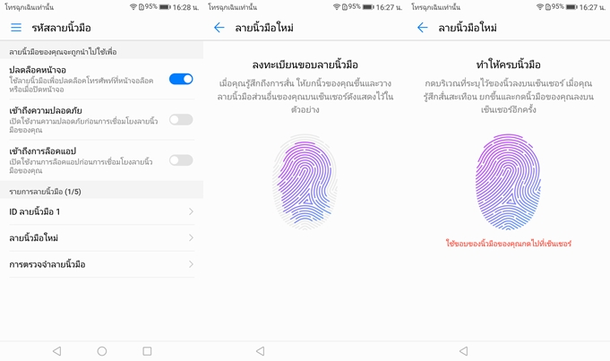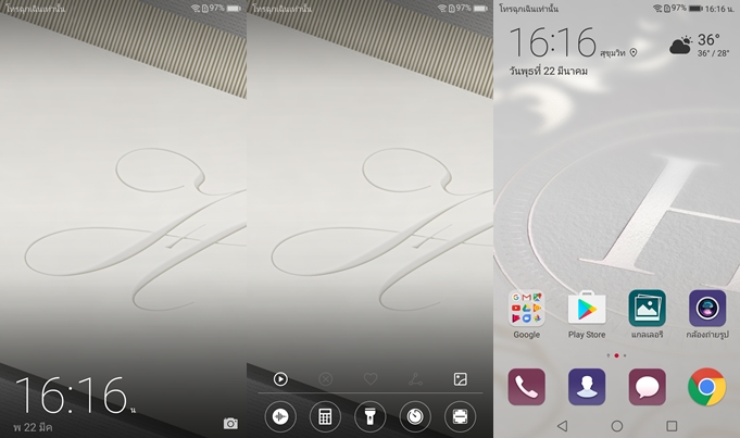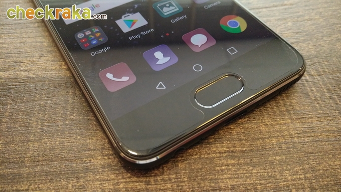 ปุ่ม Home ด้านหน้าเป็นเซ็นเซอร์สแกนลายนิ้วมือ แบ่งการใช้งานได้ 2 รูปแบบ โดยจะตั้งให้ทำงานโดยปุ่ม Home ด้านหน้า หรือตั้งค่าปุ่มสมือนบนหน้าจอก็ได้ (สามารถปรับแต่งได้ 4 รูปแบบตามความถนัด) ส่วนปุ่ม Home นั้นมีลูกเล่นที่น่าสนใจครับ โดยสามารถใช้งานเป็นปุม Back โดยการแตะที่ปุ่ม Home และทำงานเป็นปุ่ม Home ได้โดยการแตะค้างเอาไว้ และถ้าปัดนิ้วจากซ้ายไปขวา จะเป็นคำสั่ง Recent App และถ้าปัดนิ้วขึ้นจากพื้นที่ด้านขวา จะเป็นคำสั่งเรียกใช้งานแอปพลิเคชั่น Google ในส่วนสแกนลายนิ้วมือความแม่นยำ และความเร็วทำได้ดีเยี่ยมสมเป็นรุ่นระดับสูงครับ สามารถตั้งค่าลายนิ้วมือได้ 5 ลายนิ้วมือ