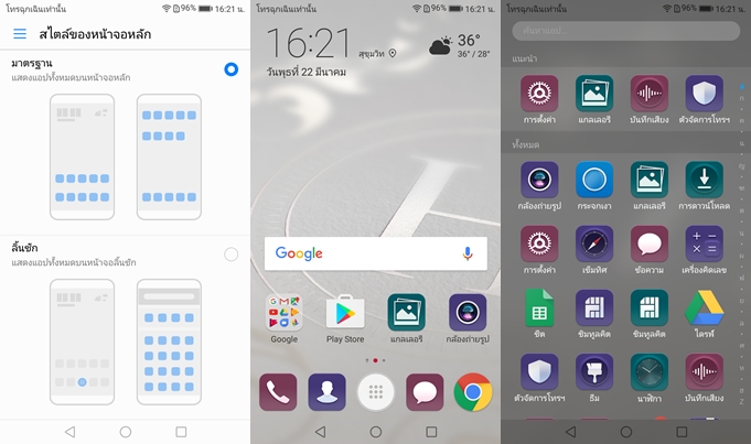 Huawei P10 ทำงานบน Android 7.0 Nougat ครอบทับด้วย EMUI 5.1 เวอร์ชั่นใหม่ที่ทาง Huawei รวมพัฒนากับ GoPro ซึ่งจะมีความโดดเด่นในโหมด Gallery หน้าตาการใช้งานจะเหมือนเวอร์ชั่น EMUI 5.0 ที่อยู่ใน Huawei Mate 9 มากเลยครับ สามารถปรับ Transition ได้ 8 รูปแบบ และเลือกอัตราส่วนไอค่อนบนหน้าจอได้ 3 รูปแบบ 4x5, 5x4, 5x5 สามารถปรับอุณหภูมิสีเพื่อถนอมสายตากรองแสงสีน้ำเงิน และ UI ออกแบบให้สามารถเลือกได้ 2 รูปแบบ ได้แก้รูปแบบเดิม และรูปแบบที่กลับมามีหน้า App Drawer (เข้าไปที่ตั้งค่า>สไตล์ของหน้าจอหลัก จะมีให้เลือก 2 รูปแบบ)