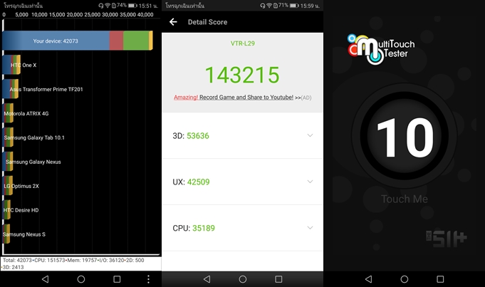 - ทดสอบด้วยแอปพลิเคชั่น AnTuTu Benchmark ทำไปได้ 143,215 คะแนน