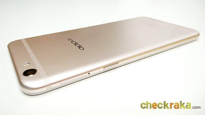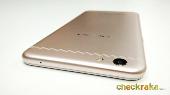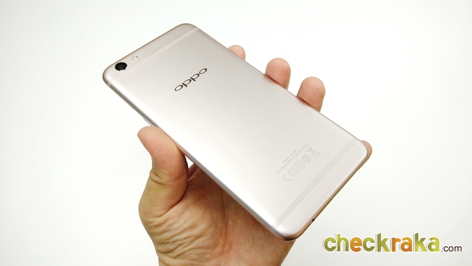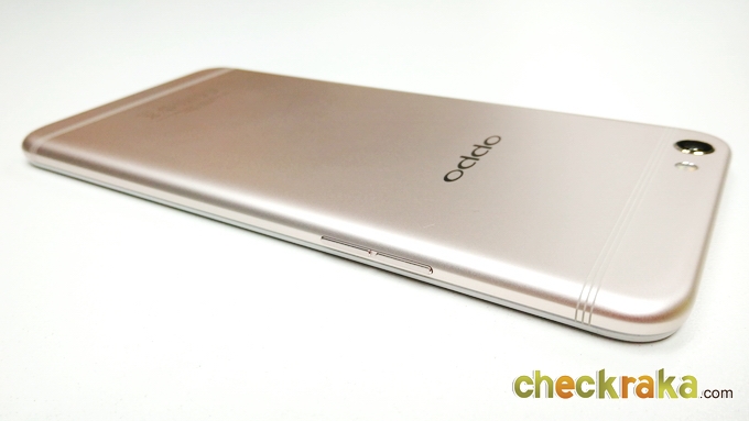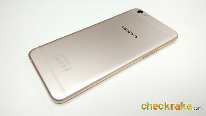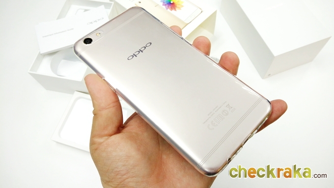 ด้านหลังจะเป็นวัสดุโลหะคลุมไปจนถึงขอบตัวเครื่องด้านข้างไร้รอยต่อ จะมีเสาอากาศเส้นเล็กๆ 3 เส้น ด้านบนและด้านล่าง ดูเนียนตามากครับ ชุดกล้องจะอยู่มุมซ้ายนูนขึ้นมาเล็กน้อย ความละเอียด 16MP ค่ารูรับแสง F1.7 และมีระบบกันสั่น OIS ข้างๆ จะมีไฟแฟลชคู่ LED แบบทูโทน ถัดมาจะเป็นโลโก้ OPPO เงางาม