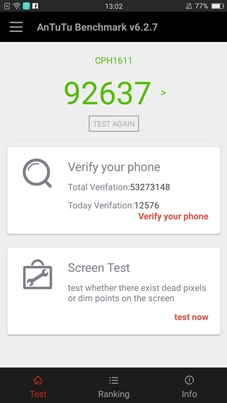 - ทดสอบด้วยแอปพลิเคชั่น AnTuTu Benchmark ทำไปได้ 92,637 คะแนน