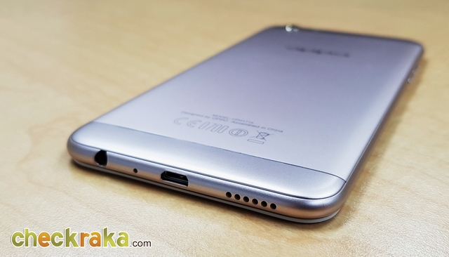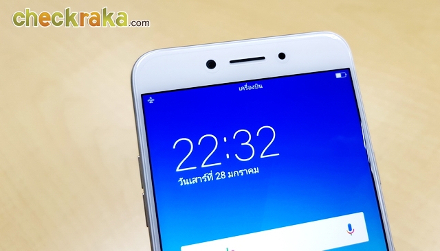 ด้านบนจะมีกล้องหน้าความละเอียด 16MP ค่ารูรับแสง F2.0 ถัดมาจะเป็นลำโพงสนทนา และเซ็นเซอร์ น่าเสียดายที่ไม่มี Notification Light มาให้ ส่วนด้านล่างจะมีปุ่ม Home แบบสัมผัส ซึ่งทำหน้าที่เป็นเซ็นเซอร์สแกนลายนิ้วมือ สามารถตั้งค่าลายนิ้วมือได้ถึง 5 ลายนิ้วมือเท่ากับพวกเครื่องรุ่นใหญ่ ความแม่นยำและความรวดเร็วทำได้ดีมาก ส่วนด้านซ้ายเป็นปุ่ม Recent App และด้านขวาเป็น Back