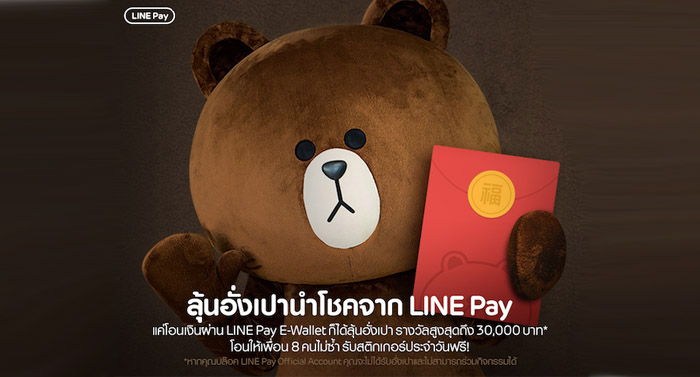 LINE Pay ช่องทางการชำระเงินจาก LINE ฉลองเทศกาลตรุษจีนด้วยแคมเปญสุดพิเศษ "อั่งเปานำโชคจาก LINE Pay" เพียงโอนเงินจากกระเป๋าเงิน LINE Pay [LINE Pay E-wallet] ให้เพื่อน ทั้งผู้โอนและผู้รับก็มีสิทธิ์ลุ้นรับอั่งเปานำโชคจาก LINE Pay มูลค่าสูงสุด 30,000 บาท และเมื่อโอนให้เพื่อน 8 คนไม่ซ้ำภายใน 1 วัน ผู้โอนยังได้รับสติกเกอร์สุดน่ารัก ฟรีจาก LINE Pay อีกด้วย มีทั้งหมด 7 เซต 7 วันให้สะสมเป็นคอลเลคชั่นกันเลย ตั้งแต่วันนี้ - 9 กุมภาพันธ์นี้เท่านั้น