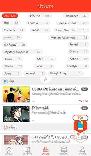 3. ประเภท : จัดหมวดหมู่ของการ์ตูนในแอพฯ โคมิโค่ ซึ่งจะแบ่งตาม รูปแบบเนื้อเรื่อง ประเภทของการ์ตูน หรือตามต้นกำเนิดของการ์ตูน ให้เราได้เลือกอ่านมากมาย จะเลือกแบบผสมผสานก็ได้ เช่น หมวด Action และหมวด Comedy