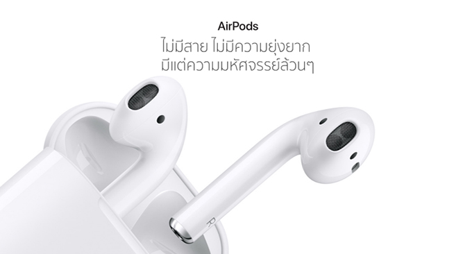ภายในวันเดียวกันกับที่ Apple เปิดตัว iPhone 7 และ 7 Plus พวกเขาก็ยังได้เปิดตัว AirPods นวัตกรรมหูฟังไร้สายใหม่ ที่ใช้เทคโนโลยีขั้นสูงพลิกโฉม มอบประสบการณ์การฟังแบบไร้สายในรูปแบบที่ไม่เคยเป็นไปได้มาก่อน