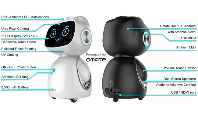 Omate Yumi หุ่นยนต์ Android รุ่นใหม่ รองรับคำสั่งเสียง Amazon Alexa (คล้ายกับ Siri ของ Apple) สำหรับตัวหุ่นยนต์จะมีไฟแจ้งเตือน Notification Light อยู่ที่บนหัว ใบหน้าของหุ่นยนต์จะมีหน้าจอขนาด 5 นิ้ว ความละเอียด HD 720P พร้อมด้วยกล้องความละเอียด 5MP สำหรับ video calls แถมสามารถทำงานเป็นกล้องวงจรปิดได้อีกด้วย