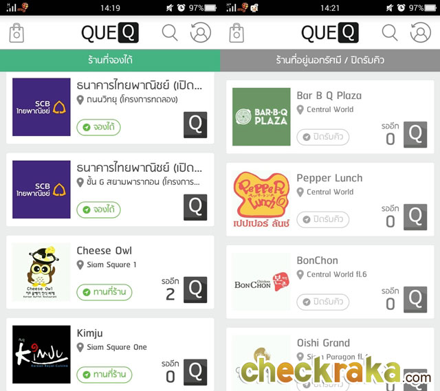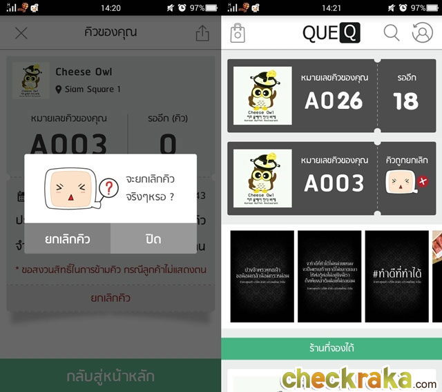หลังจากนั้นเราจะเห็นร้านอาหารหรือธนาคารที่สามารถจองคิวผ่าน QueQ ได้อยู่ในบริเวณนั้น ทั้งในรัศมี 1 กิโลเมตร หรือนอกรัศมี หากร้านที่อยู่ในรัศมีนั้นเราสามารถเช็คคิวและกดจองคิวได้เลย ซึ่งในภาพนั้นเราได้ทำการจองคิวที่ร้าน Cheese Owl ที่ Siam Square1 ชั้น 4 ซึ่งคิวก่อนเรานั้นอยู่ที่ 18 คิว!!! อ่านไม่ผิดค่ะ 18 คิวจริงๆ