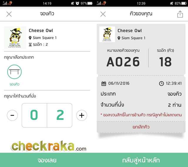 แต่ด้วยเพราะความที่อยากกินมากเลยยอมและรีบเลือกจำนวนคนและทำการจองได้ทันที จากนั้นจะขึ้นเป็นหน้าบัตรคิวให้เราซึ่งรายละเอียดในนั้นจะบอกหมายเลขคิวของเรา จำนวนคิวก่อนหน้าเราประเภท วันเวลาและจำนวนที่จอง หรือถ้าเราเกิดเปลี่ยนใจจะไปทานร้านอื่นก็สามารถกดยกเลิกคิวได้เลย