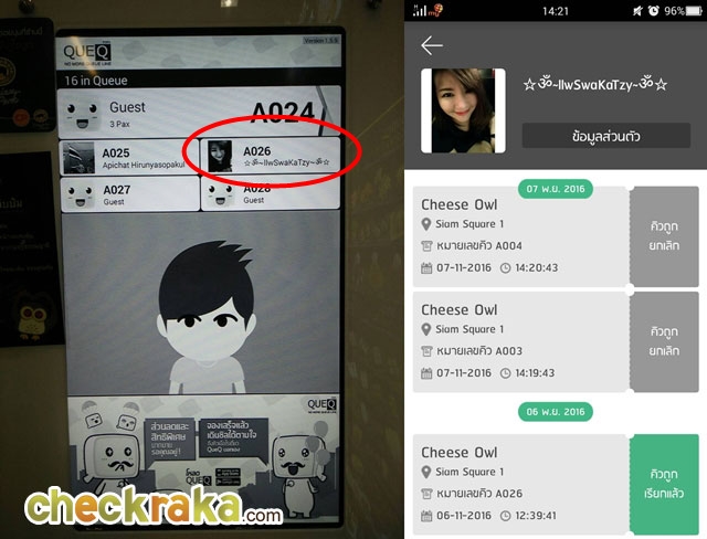 เมื่อเรากดออกจากแอปพลิเคชั่นแล้วเข้ามาใหม่ หมายเลขคิวที่จองก็ยังโชว์อยู่ หากใกล้ถึงคิวเราจะมีการแจ้งเตือนจากแอปพลิเคชั่นให้รู้อีกด้วย และเมื่อถึงคิวเราจะเห็นหมายเลขเราคิวรันอยู่ที่จอหน้าร้านแบบในภาพ