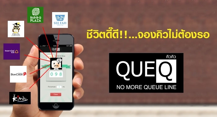QueQ คือ แอปพลิเคชั่นที่จะช่วยให้เราไม่ต้องรอคิวหน้าร้านอาหารนานๆ อีกต่อไป เพราะเราสามารถจองคิวผ่านแอปพลิเคชั่นนี้ได้เลย ตั้งแต่ยังอยู่บนรถหรือระหว่างเดินทางไปที่ร้าน ภายในรัศมีในรัศมี 1 กิโลเมตร เจอร้านที่ถูกใจเมื่อไรก็จองคิวได้ทันที และยังสามารถดูได้ว่ามีคิวก่อนหน้าเรากี่คิว ต้องรอประมาณกี่นาที ซึ่งระหว่างที่รอก็ไม่ต้องเสียเวลาไปนั่งหรือยืนรอคิวตัวเองอยู่หน้าร้าน ใกล้ถึงเมื่อไร เพราะ QueQ นั้นจะแจ้งเตือนไปที่มือถือของเราเองหากใกล้ถึงคิวของเรา