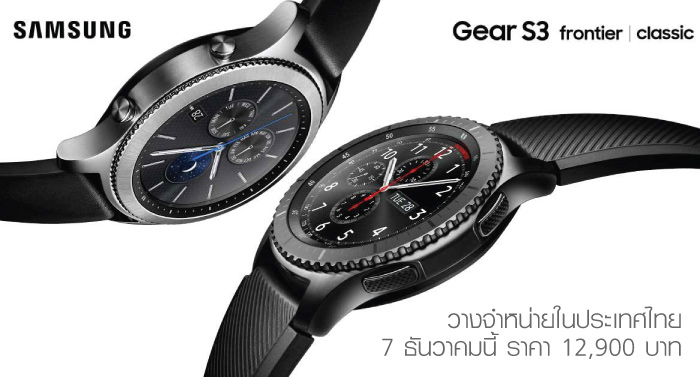 Samsung Gear S3 Classic (สายหนัง) และ Frontier (สายซิลิโคน) วางจำหน่ายในประเทศไทย 7 ธันวาคมนี้ ราคา 12,900 บาท ราคาเท่ากันทั้ง 2 รุ่นครับ แถมทั้ง 2 รุ่นรองรับมาตรฐาน IP68 กันน้ำได้ลึกสูงสุด 1.5 เมตร นานสุด 30 นาที กระจก Gorilla SR+ ป้องกันรอยขีดข่วน