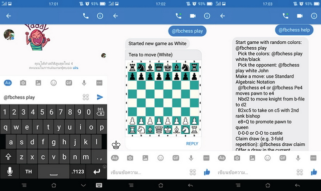 Chess หรือหมากรุกสากล ค่อนข้างเล่นยากมากๆ ครับ วิธีเปิดขึ้นมาเล่นให้พิมพ์คำว่า @fbchess play ลงบนช่องแชท เกมก็จะเปิดขึ้นมาพร้อมให้เล่นทันที สำหรับคนที่สงสัยว่าเล่นยังไง สามารถใช้คำสั่ง @fbchess help ก็จะมีวิธีเล่นขึ้นมาอธิบาย