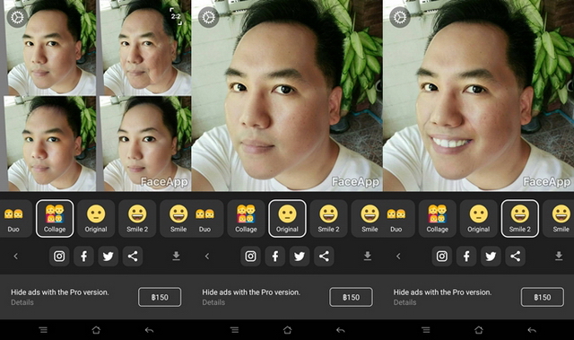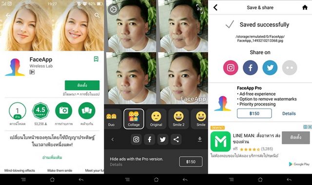 แอปพลิเคชั่น FaceApp มีให้ดาวน์โหลดทั้ง Android และ iOS มีลูกเล่น ได้แก่ Duo (ภาพเทียบกัน 2 ภาพ), Collage (ภาพเทียบกัน 4 ภาพ), Original (ภาพดั้งเดิม), Smile (ภาพรอยยิ้ม), Smile 2 (ภาพรอยยิ้มแบบที่ 2), Spark (ภาพแต่งให้ดูดีกว่าเดิม), Old (ภาพคนแก่), Young (ภาพเด็ก), Female (ภาพผู้หญิง), Male (ภาพผู้ชาย) โดยเราสามารถถ่ายภาพขึ้นมาใหม่ หรือใช้ภาพในสมาร์ทโฟนของเราก็ได้ และสามารถนำไปแชร์สู่แอปพลิเคชั่น Social ที่เราใช้งาน หรือจะเลือกบันทึกเก็บไว้บนสมาร์ทโฟนของเราเท่านั้นก็ได้ครับ