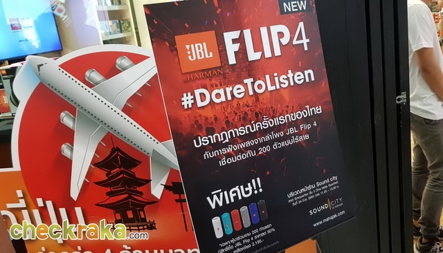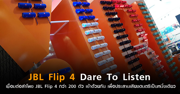 และเมื่อวันที่ 24 มิถุนายนที่ผ่านมา บริษัท มหาจักรดีเวลอปเมนท์ จำกัด ผู้นำเข้า JBL อย่างเป็นทางการในประเทศไทย ได้เปิดตัวสินค้าใหม่ในงาน "JBL Flip4 Dare To Listen" ปรากฎการณ์ครั้งแรกในเมืองไทย ที่เชื่อมต่อลำโพง JBL Flip 4 กว่า 200 ตัว เข้าด้วยกัน เพื่อประสานเสียงดนตรีเป็นหนึ่งเดียว ที่หน้าร้าน SoundCity สาขา Emquartier ชั้น 3
