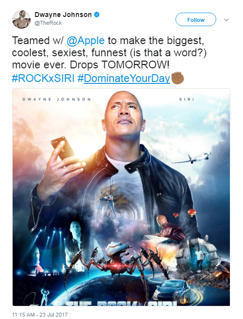 Dwayne Johnson หรือที่รู้จักกันดีในชื่อว่า "The Rock" นักแสดงชื่อดัง และนักมวยปล้ำระดับตำนาน ได้แสดงในภาพยนตร์โฆษณาให้กับ Apple ในชื่อ The Rock X Siri: Dominate the Day เพื่อเป็นการโปรโมทฟังก์ชั่นผู้ช่วยส่วนตัวของ Apple อย่าง Siri นั่นเอง โดยทาง Dwayne Johnson ได้ออกมาพูดว่ามันเป็นภาพยนตร์ที่ยิ่งใหญ่ เจ๋ง เซ็กซี่ สนุกสนาน และจะได้ชมกันในวันนี้แล้วผ่านช่องทาง Youtube จากภาพโปรโมท The Rock X Siri: Dominate the Day จะเป็นภาพยนตร์แนวแอคชั่น-ไซไฟ ดูน่าสนใจมากทีเดียวครับ