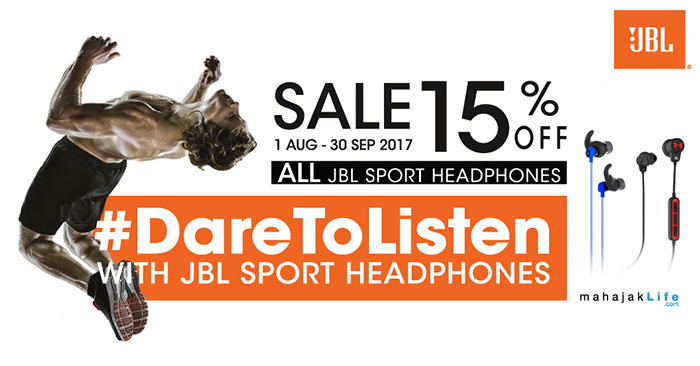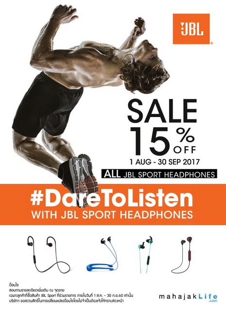 Dare To Listen with JBL Sport Headphones หูฟังสำหรับคนรักการออกกำลังกาย กับโปรโมชั่นส่วนลด 15% ทุกรุ่น พร้อมร่วมสนุกกับกิจกรรม JBL Dare To Listen ที่จะไปยังร้านค้าตัวแทนจำหน่ายหูฟัง JBL ที่ร่วมรายการ พร้อมเล่นเกมส์ลุ้นรับของรางวัลพรีเมี่ยมและ Gift Voucher มูลค่า 500 บาท
