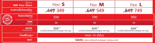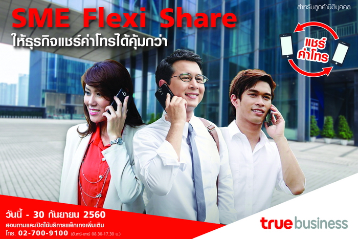 ทรูบิสิเนส แนะนำ SME Flexi Share แพ็กเกจสุดคุ้มใหม่ล่าสุดเอาใจลูกค้าองค์กรธุรกิจขนาดกลางและขนาดย่อมทุกประเภท (เอสเอ็มอี) ทั้งเปิดเบอร์ใหม่หรือย้ายค่ายเบอร์เดิม สร้างโอกาสพูดคุยธุรกิจได้เต็มที่ เมื่อสมัคร SME Flexi Share แพ็กเกจ Flexi S, Flexi M หรือ Flexi L โดยเปิดใช้บริการ 3 เลขหมายขึ้นไปในองค์กรเดียวกัน สามารถแชร์ค่าโทรและส่งข้อความ โทรหากันในกลุ่มได้ฟรีตลอด 24 ชั่วโมง พร้อม WiFi ไม่จำกัด
