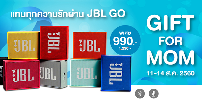 บริษัท มหาจักรดีเวลอปเมนท์ จำกัด ผู้นำเข้าเครื่องเสียงยี่ห้อ JBL จัดโปรโมชั่นฉลองวันแม่ ด้วยการบอกรักแม่ให้ดังๆ ด้วย JBL GO ลำโพงพกพาไซส์มินิ ในราคาพิเศษ จากปกติ 1,290 บาท เหลือเพียง 990 บาทเท่านั้น ตั้งแต่วันนี้ - 14 ส.ค. 2560 ที่ร้านค้าตัวแทนจำหน่ายทั่วประเทศ
