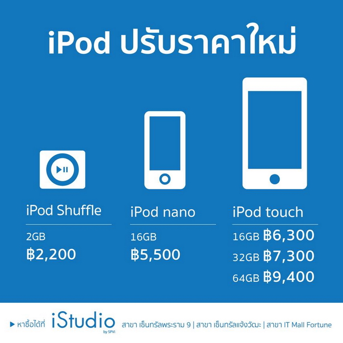 เรียกว่าพลาดไม่ได้เลยครับ ล่าสุด iStudio by SPVi ปรับราคา iPod ทุกรุ่นทั้ง iPod Shuffle, iPod nano และ iPod touch ผ่อนชำระสบายๆ 0% นานสูงสุด 10 เดือน เฉพาะ iStudio by SPVi สาขาดังต่อไปนี้ สาขา เซ็นทรัลพระราม 9, สาขา เซ็นทรัลแจ้งวัฒนะ และสาขา IT Mall ฟอร์จูน ตั้งแต่วันนี้เป็นต้นไป
