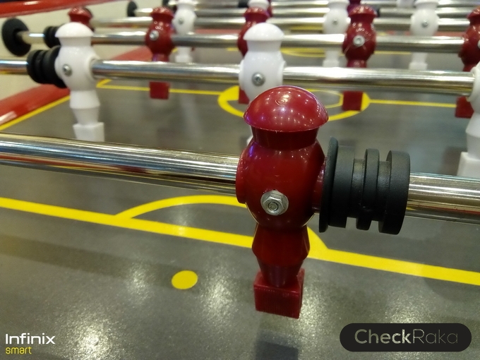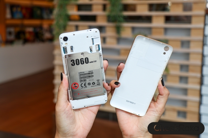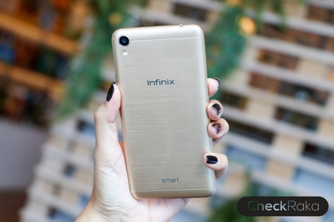 ด้านหลังดูเรียบหรู ผิววัสดุมีการออกแบบเหมือนผิวโลหะขัดลาย จับแล้วให้ความรู้สึกที่ดีและกันลื่นไปในตัว มีกล้องความละเอียด 8MP อยู่ที่มุมบนด้านซ้าย และไฟแฟลชคู่ LED ด้านหลังมีโลโก้ Infinix อยู่ตรงกลาง และด้านล่างมีชื่อรุ่น Smart สำหรับฝาหลังเวลาแกะต้องถอดออกมาทั้งชิ้น รวมไปถึงด้านข้างตัวเครื่อง โดยจะมีร่องเล็กๆ สำหรับแกะฝาหลังอยู่ที่ด้านล่างขวามือ แกะง่ายครับไม่ยาก
