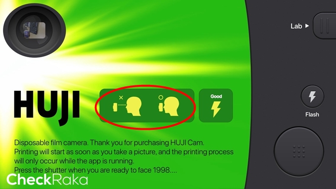 หลังจากดาวน์โหลดแอปฯ Huji Cam แล้วให้เปิดแอปนี้ขึ้นมา จะเจอหน้าแรกของแอป ให้เราแนบหน้าเข้าไปใกล้ๆ หน้าจอเพื่อทำการเปิดกล้องถ่ายภาพ
