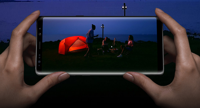 Samsung Galaxy Note 8 มาพร้อมกล้องคู่ Dual Camera ประกอบด้วยเลนส์มุมกว้าง (Wide-Angle Lens) ช่วงเลนส์ 26 มม. และเลนส์เทเลโฟโต้ (Telephoto Lens) ช่วงเลนส์ 52 มม. ความละเอียด 12MP ค่ารูรับแสง F1.7 + 12MP ค่ารูรับแสง F2.4 รองรับ Optical Zoom 2X ซึ่งมาพร้อมฟีเจอร์ Live Focus สามารถปรับเอฟเฟกต์โบเก้ได้ตามใจชอบ และสามารถเก็บภาพพร้อมกัน และบันทึกไว้ทั้งสองภาพภายในช็อตเดียว โดยจะได้ทั้งภาพแบบมุมกว้าง และแบบเทเล มาพร้อมระบบกันสั่น OIS (Optical Image Stabilization), Phase Detection Autofocus และไฟแฟลชคู่ LED บันทึกวีดีโอความละเอียด 2160p@30fps และกล้องหน้าความละเอียด 8MP ค่ารูรับแสง F1.7